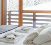 There is access to the balcony that looks onto the piste, with views beyond. There are two double bedrooms and one twin all with en-suite facilities. At the end of a days skiing you can relax on the large terrace or use the chalet sauna.