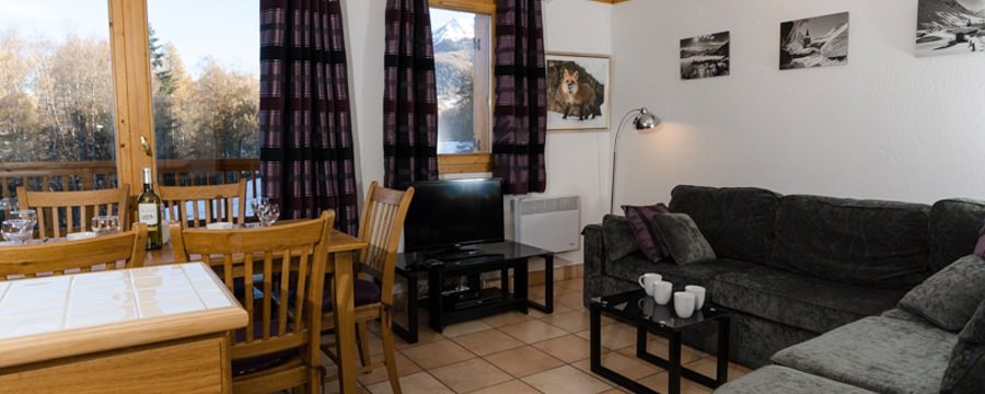 This duplex top floor apartment with three bedrooms upstairs has spectacular view of the Tarentaise valley and Mont Blanc from the bedrooms and the lounge downstairs.